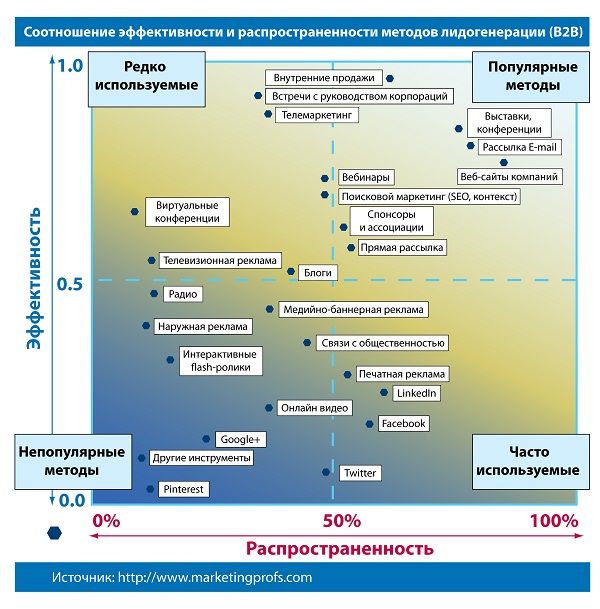 Благодаря независимому американскому агенству маркетинговых исследований http://www.marketingprofs.com/ рады поделиться с вами наглядной картой по эффективности методов генерации лидов бизнес-аудитории. Верхний правый угол - самые эффективные и популярные методы.